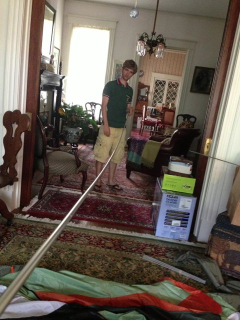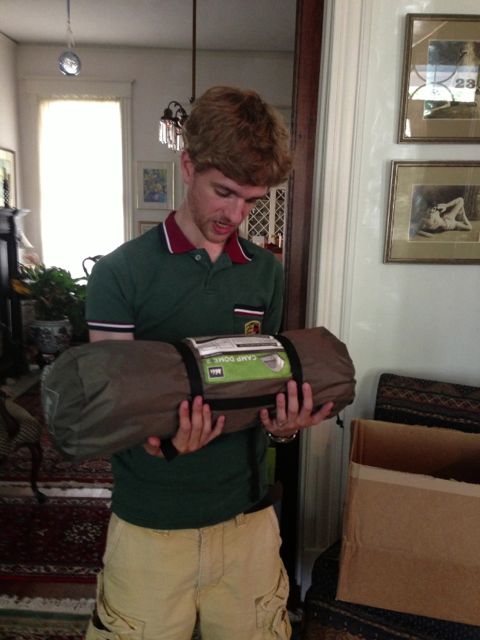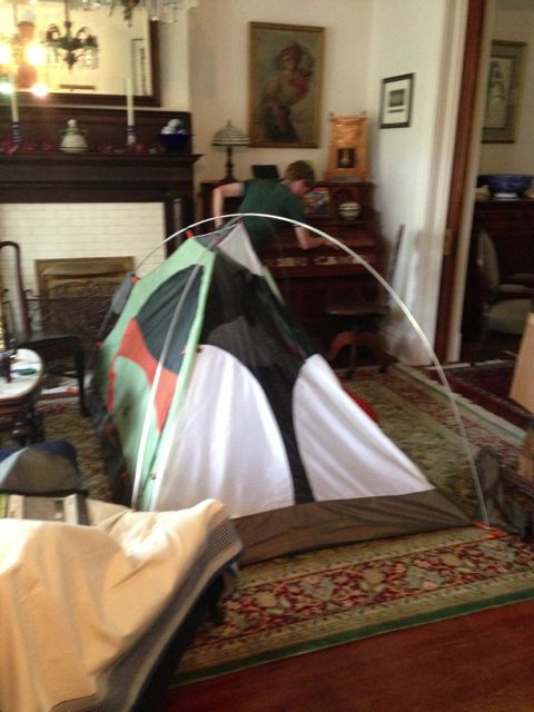 We had planned to go on a trial-run camping trip in Virginia, but several elements (namely, torrential downpours and the un-timely arrival of our sleeping bags) conspired against us. With our June 12th departure date fast upon us, we decided to go with the next-best option: urban camping in my mom’s living room.